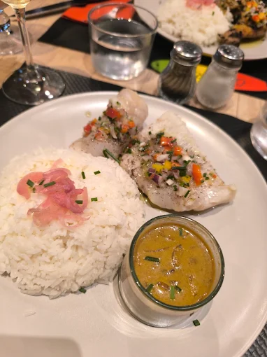 Accompagné de ses petits légumes et de riz parfumé